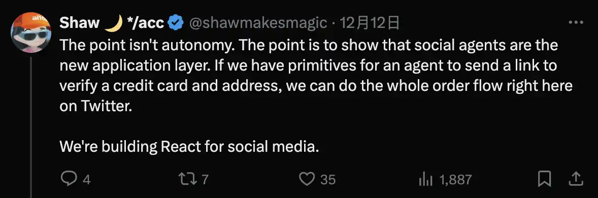 当然这一操作也引发了质疑,怀疑这有可能是被设定好的程序,而不完全是 AI Agent 自治的。这也是许多 Web3 的 AI Agent 让人怀疑的问题之一。Eliza 的创始人 Shaw 也对这件事表达了自己的观点,「重点不在于自主性,重点是要表明社交代理是新的应用层。如果我们有代理发送链接来验证信用卡和地址的原语,我们就可以在 Twitter 上完成整个订单流程。我们正在为社交媒体上构建交互反馈」