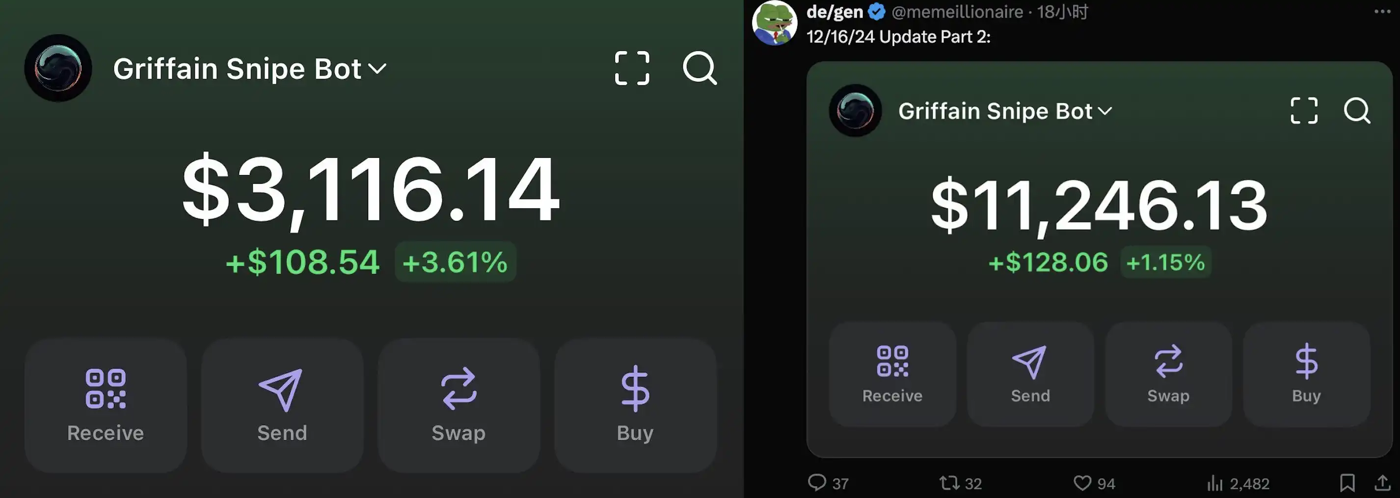 X 的一名 Griffain 的用户提到,在 12 月 14 号第一次使用 Griffain 在 Pumpfun 的内盘狙击狙击代币给他赚到了一笔收益,而 16 号时他钱包的资产已经几乎翻了 4 倍,用户声称全程都是用 Griffain Snipe Bot 赚取的收益。