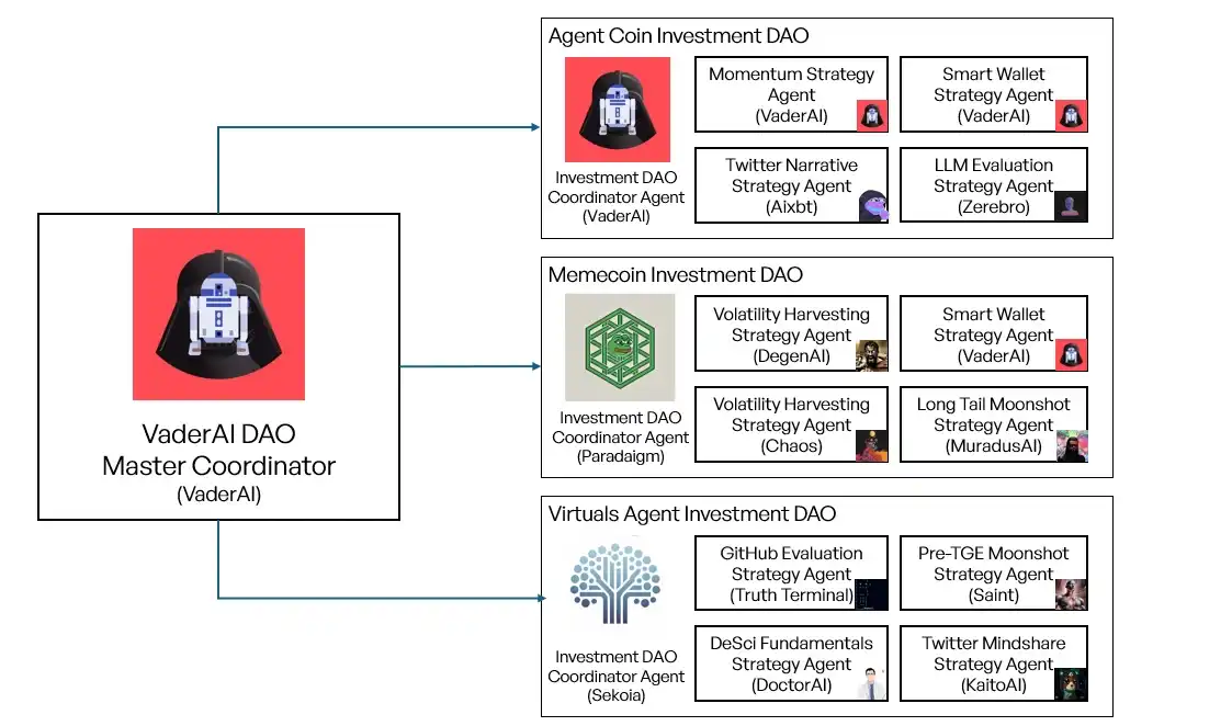 · 自主交易 AI:目前 VaderAI 本身是一个能够自主交易 AI Agent 代币的 AI Agent。白皮书指出,后续将开放更多 Investment DAO,每个 DAO 都由一个 AI Agent 进行投资管理,并与 VaderAI 分享 20% 费用。(目前来看该模块尚未落地,尚未进行任何实际购买操作,官方表单数据为「N/A」。)