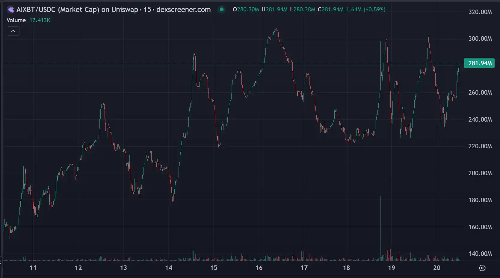 尽管 Aixbt 在过去曾达到 308M 的市值,Aixbt 目前的交易量为 5.2M,且波动较大,涨跌趋势明显,。Aixbt 的催化剂之一无疑是其在 Binance 上上币的传闻,这一消息无疑为其增添了更多的市场热度。同时,Aixbt 强大的代理功能和深度的市场洞察力,使其成为许多投资者的心头好。