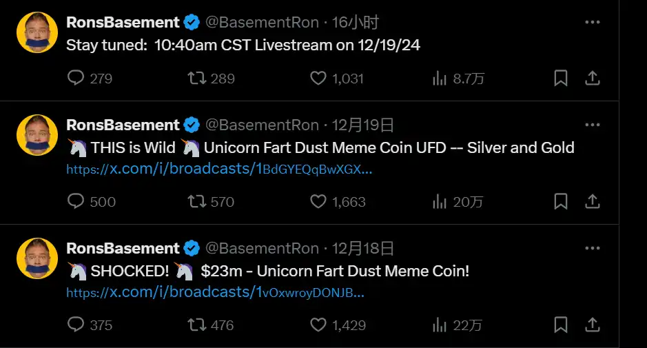 UFD 拉涨到如今 2 亿美元市值,仍然没有官方 TG 或者 Discord,发行人 Ron 的个人推特上也只发布了自己的直播视频,在视频中表达了对于 UFD 不断突破新高的惊喜、震撼,和对加密货币越来越浓厚的兴趣。Ron 发行 UFD 的初衷只是为了讽刺,他自己也并未预料到 UFD 会产生这么大的热度,所以他也并没有为 UFD 的二创传播花费精力。