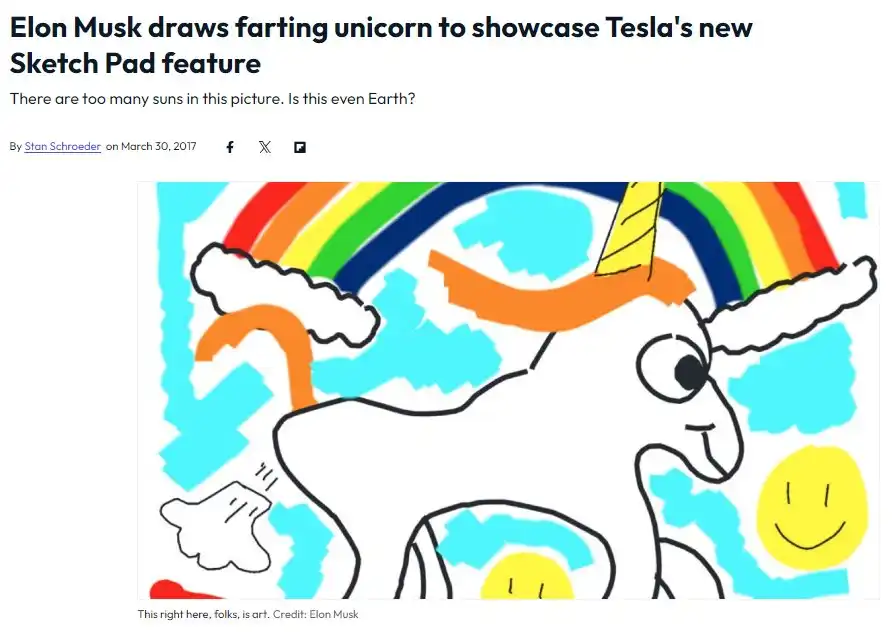 而 UFD 的叙事完美结合了 Fartcoin 的热度,又增添了讽刺意味。一位 54 岁的拥有白银和黄金投资频道的 YouTuber 贵金属投资者在看到 Fartcoin 市值达到 5 亿美元后,决定创建自己的 meme 币 Unicorn Fart Dust「独角兽屁尘」,作为对加密货币的社会实验,以验证加密货币是否是有价值的资产。之所以选择 Unicorn,有网友推测是因为马斯克之前为特斯拉画了一幅「放屁的彩虹独角兽」。