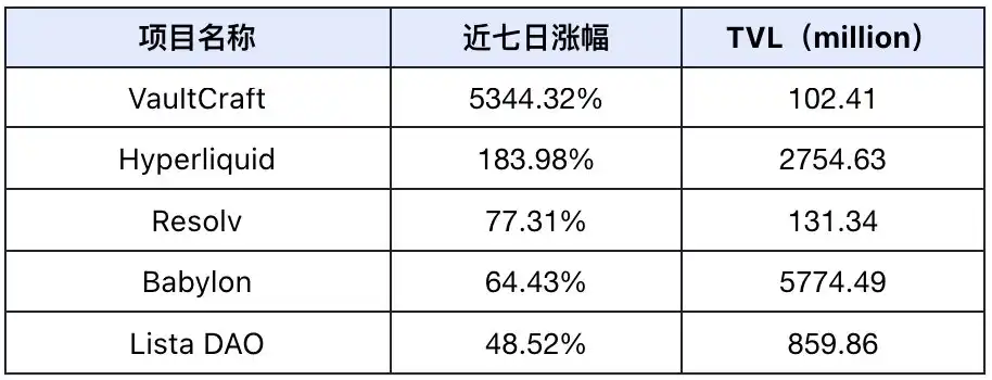 过去一周市场项目 TVL 涨幅前 5 名(未计入 TVL 较小的公项目,标准为 3000 万美元以上),数据来源:Defilama