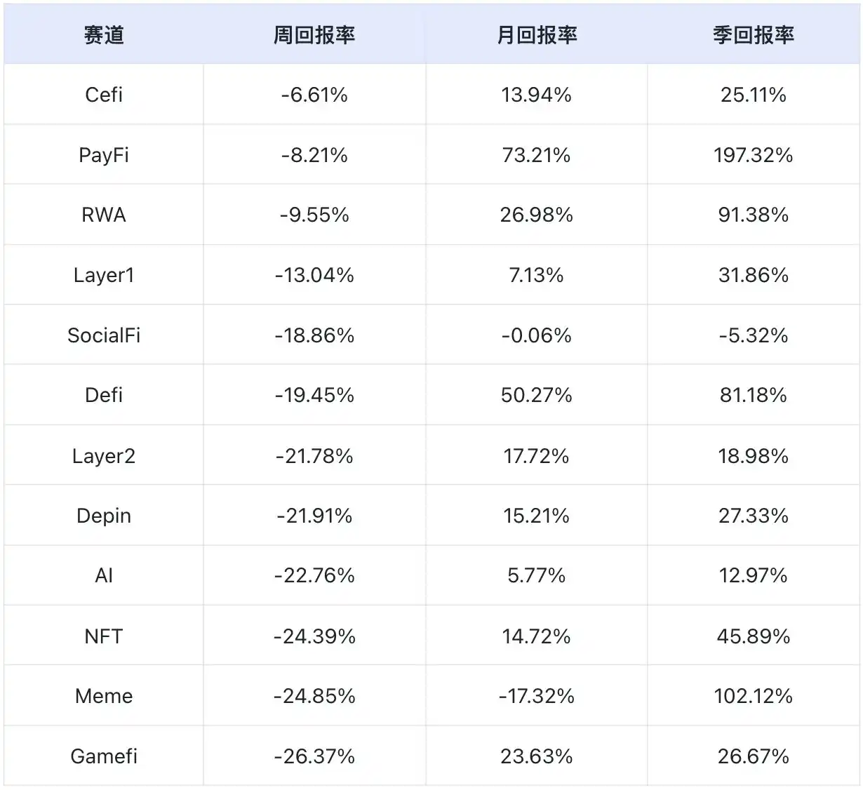 按周回报率统计,Cefi 赛道表现最佳,而 Gamefi 赛道表现最差。