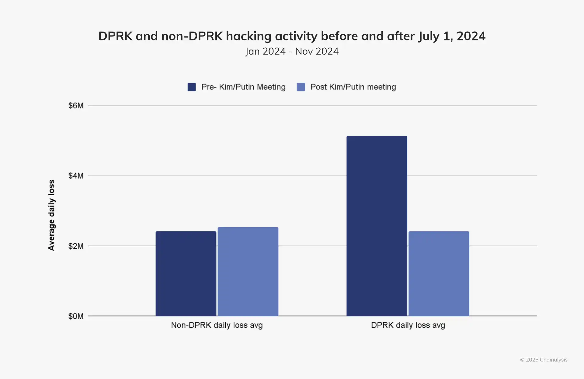 2024 年 7 月 1 日之后朝鲜窃取资金的下降是显而易见的,时机也很明显,但值得注意的是,这种下降不一定与普京访问平壤有关。此外,12 月发生的一些事件可能会在年底改变这种模式,而且攻击者经常会在假期期间发动袭击。