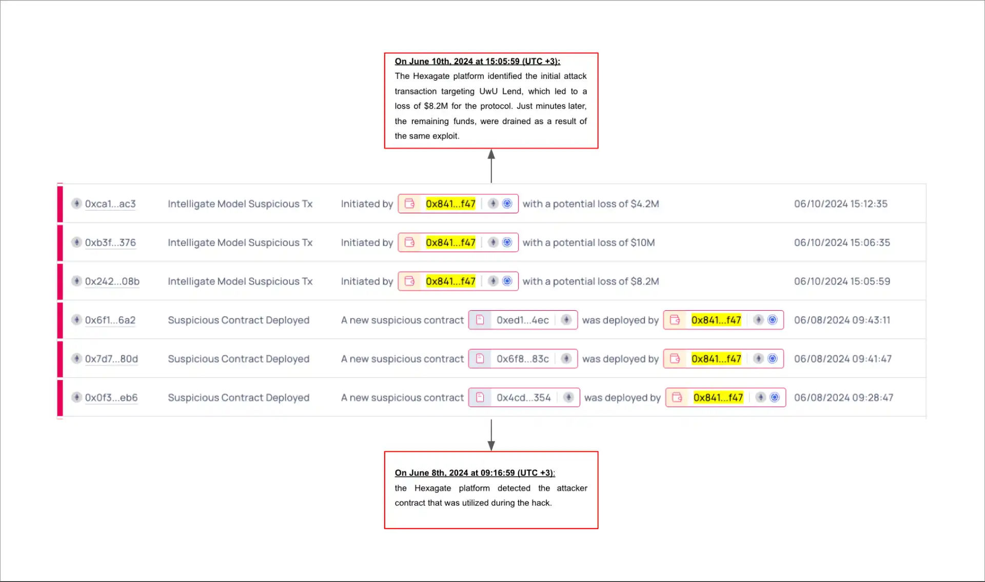 尽管攻击合约在漏洞利用前两天被准确地实时检测到,但由于其设计原因,其与被利用合约的联系并未立即显现出来。借助 Hexagate 的安全预言机等其他工具,可以进一步利用这种早期检测来减轻威胁。值得注意的是,导致 820 万美元损失的第一次攻击发生在后续攻击前几分钟,这提供了另一个重要信号。