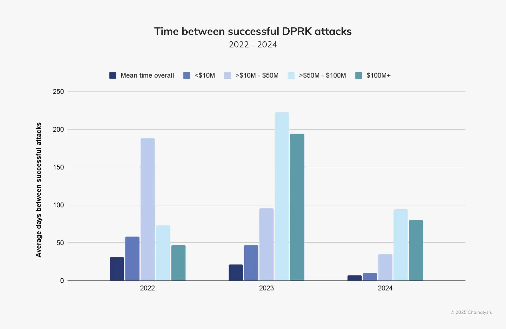 不幸的是,朝鲜的加密货币攻击似乎变得越来越频繁。在下图中,我们根据漏洞利用规模检查了 DPRK 攻击成功之间的平均时间,发现各种规模的攻击均同比下降。值得注意的是,2024 年价值 50 至 1 亿美元以及 1 亿美元以上的攻击发生频率远高于 2023 年,这表明朝鲜在大规模攻击方面做得越来越好、越来越快。这与前两年形成鲜明对比,前两年其每次的利润往往低于 5000 万美元。