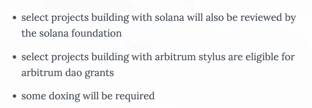 正式的参与者首先需要提交一份提案「清楚地阐述专案的目标、技术方案、团队背景以及团队对$arc 生态的贡献等」,随后需要提案审核「团队以及核心社区成员会对其进行各种维度的评估」,当提案通过后才会在允许项目名字出现在注册名单上,相当于团队帮忙先做了第一部分的尽职调查才把项目展示在社区成员面前,而后才是他们自己筹集资金或者社区捐款的形式组成 arc 或者 Sol 交易对的阶段。