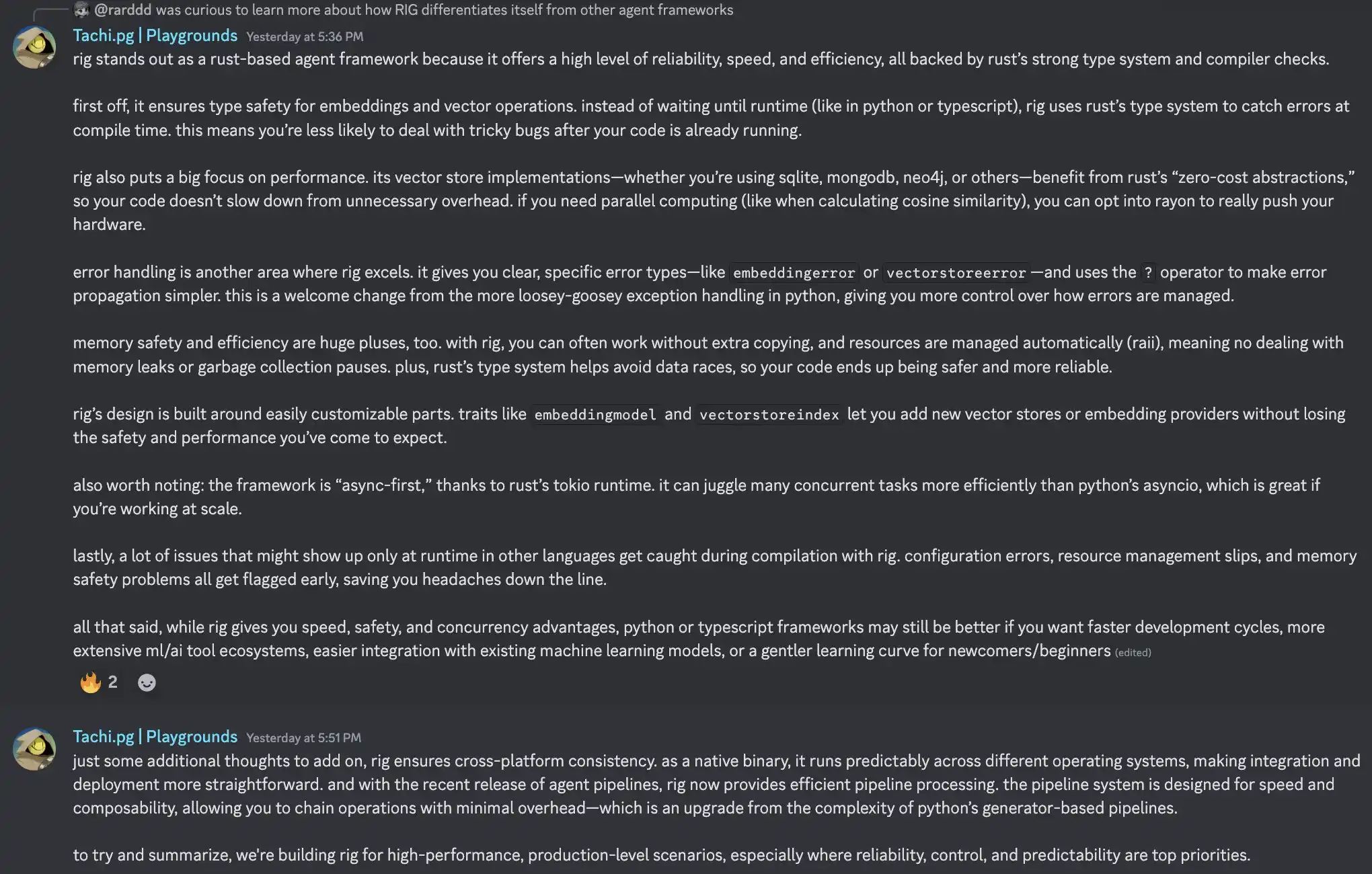 Tachi 在 Discord 社区内回复 Rig 相比于其他 agent 架构的优势