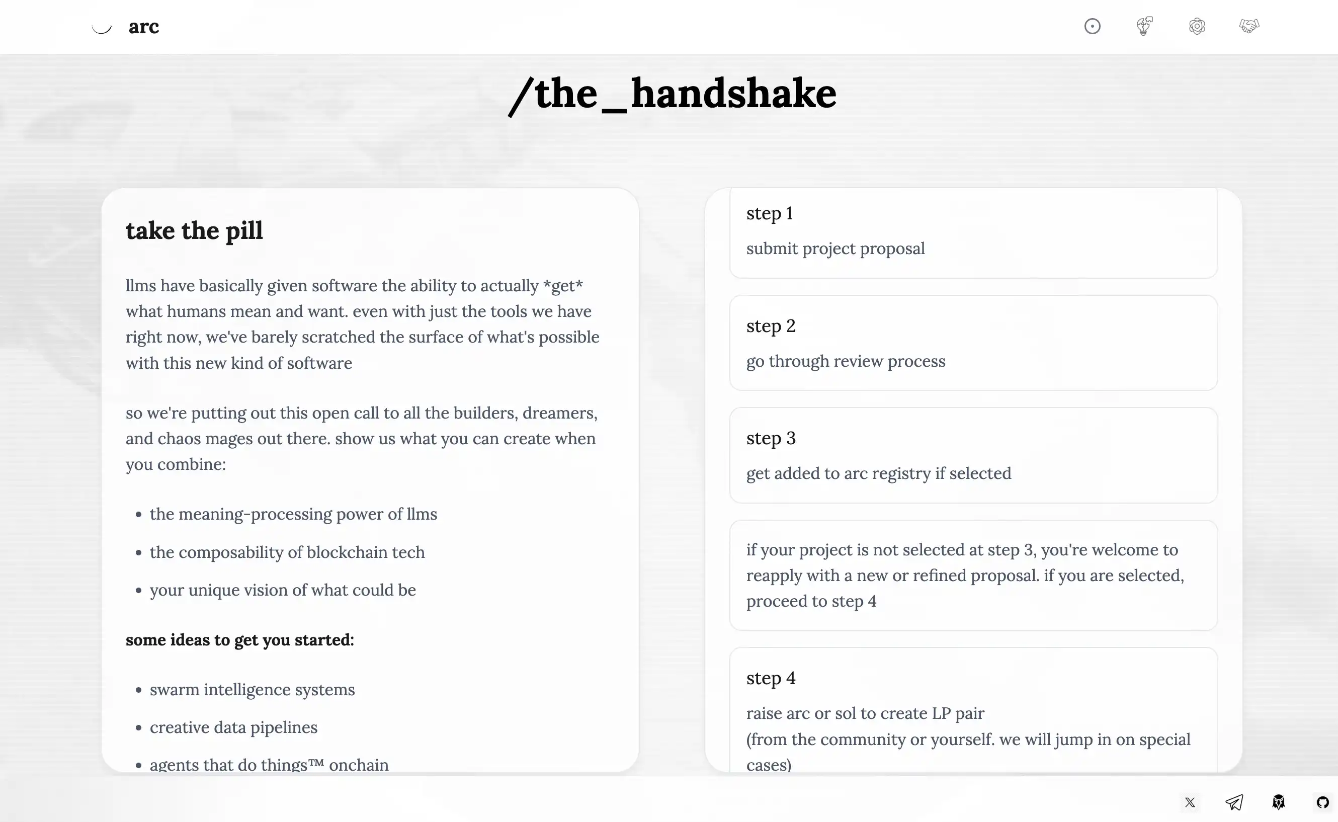 在几乎每天都有新概念的项目跑出来,技术快速迭代的同时也充斥着大量的 Scam,这也是区块链常常让人诟病的一点,不伦板块怎么轮动总是会有诈骗项目去消耗市场对某概念的信任度,仿佛是葛兰辛法则的一次次重现,arc 在其中的做法正好相反。前段时间官网显示的 prologue「序幕」也终于在近日掀开了第一层面纱,团队称他为 handshake,宣传视频从机器人和人类版本的「创造亚当」开始到两只手慢慢靠近像是要握手,寓意着人类和 AI Agent 的合作时代来临,颇具玩味。