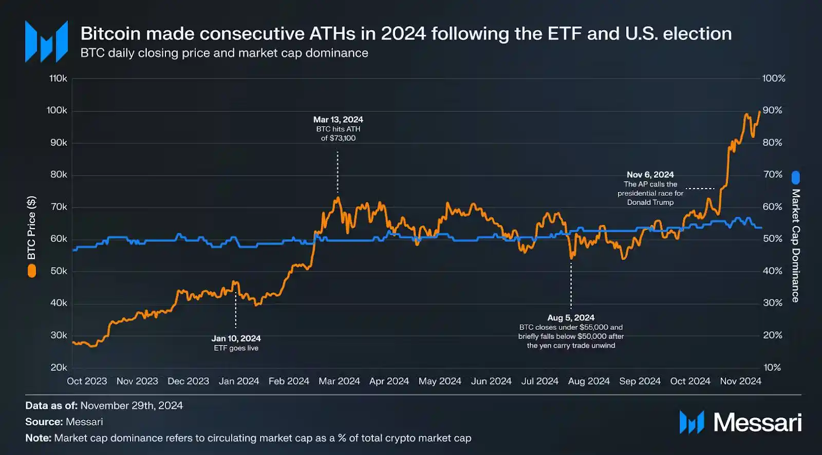 · 2024 年,机构资金的进入不再是空谈。比特币和以太坊 ETF 的获批标志着加密资产类别获得正式认可,为机构和零售投资者提供了更便捷的准入渠道;