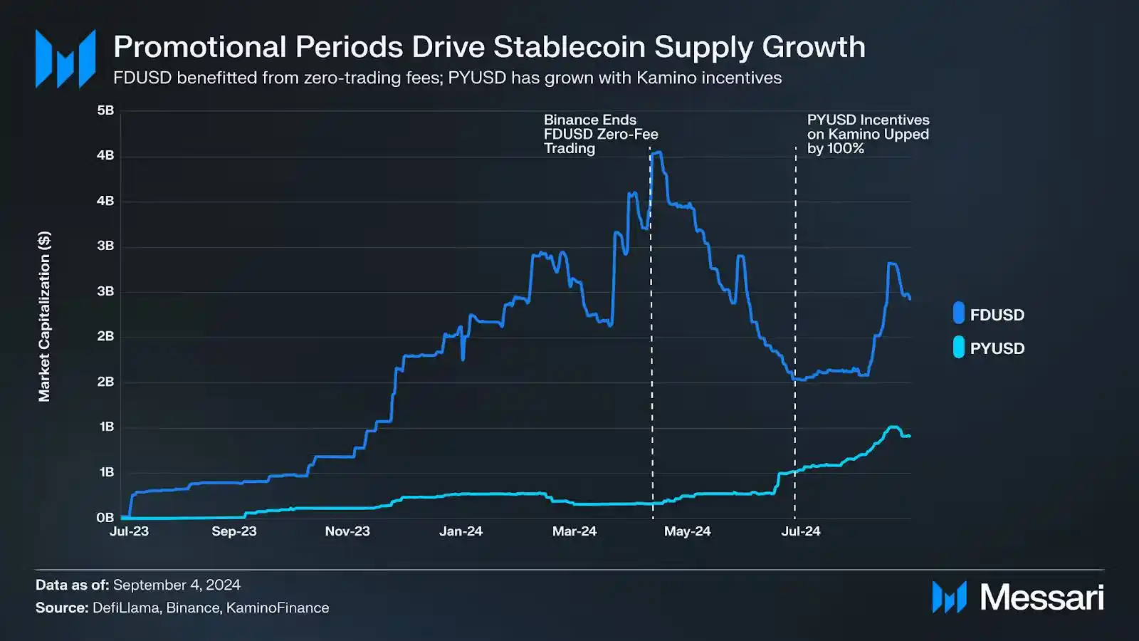 · PayPal 在 5 月份在 Solana 上发行了其稳定币 PYUSD,由 Nick Van Eck 支持的 Agora 也在多个链上推出了稳定币 AUSD,该资产由 Van Eck(资产管理公司)支持并由 State Street 托管;