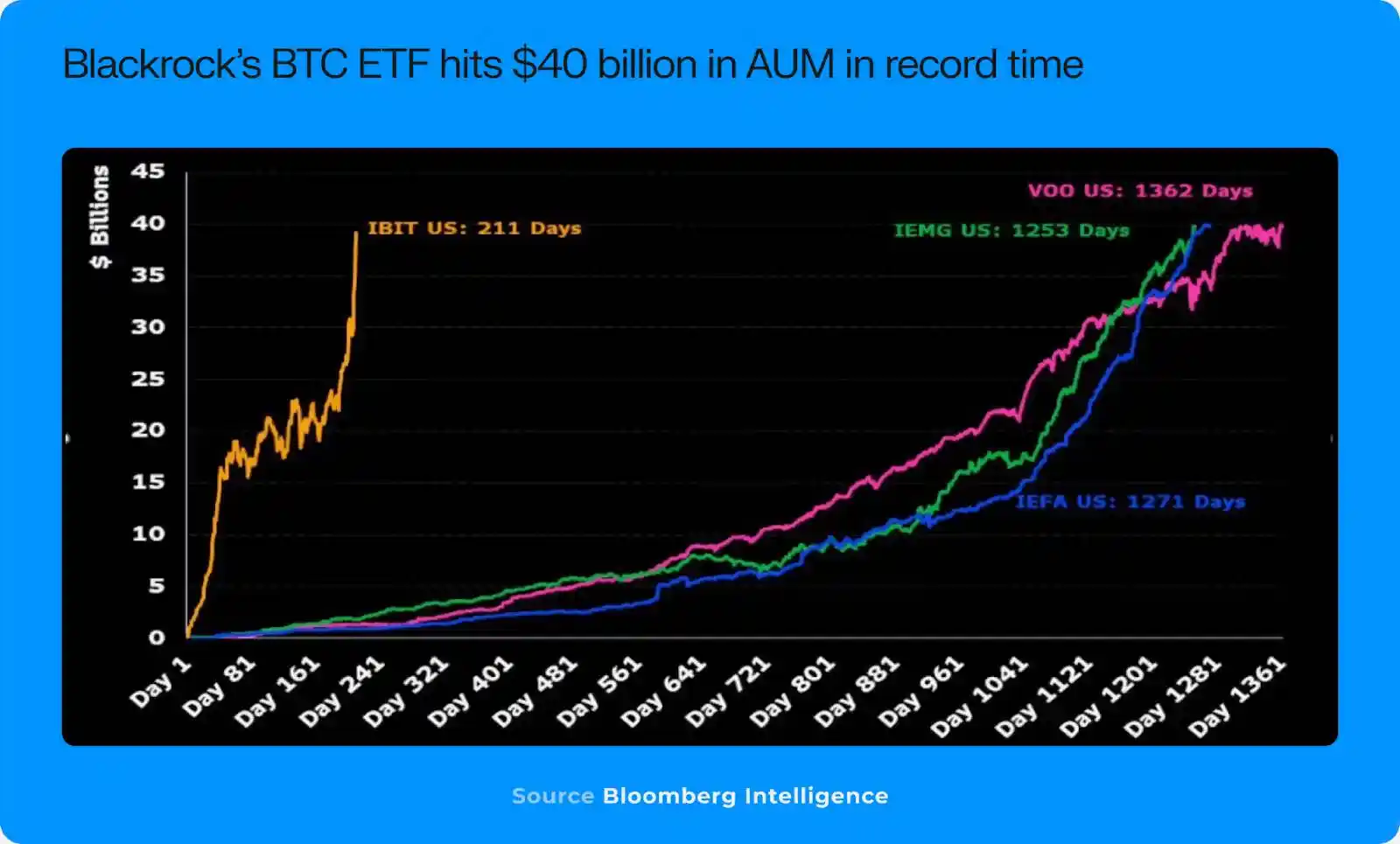 · BlackRock 的 IBIT 创造记录:首个在发行 30 天内达到 30 亿美元 AUM 的 ETF,并在约 200 天内突破 400 亿美元。显示出机构对加密衍生品的强烈需求;