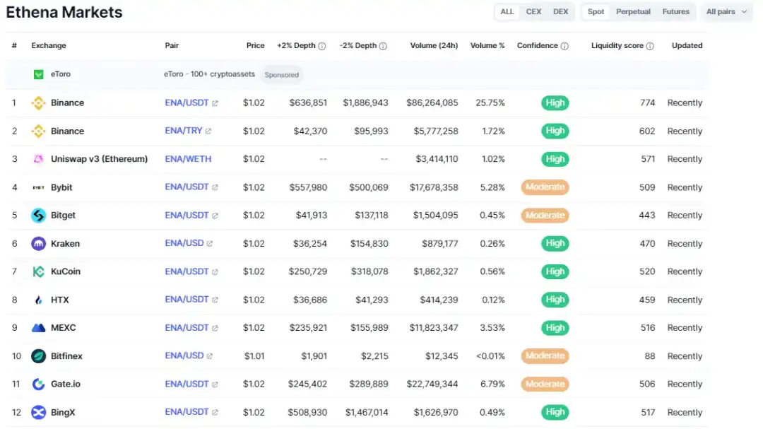 在流动性方面,ENA 在主流交易所的表现卓越,交易量持续位居前列,这不仅证明了 Ethena 协议的市场活跃度,也表明了其获得了市场的广泛认可和接受。