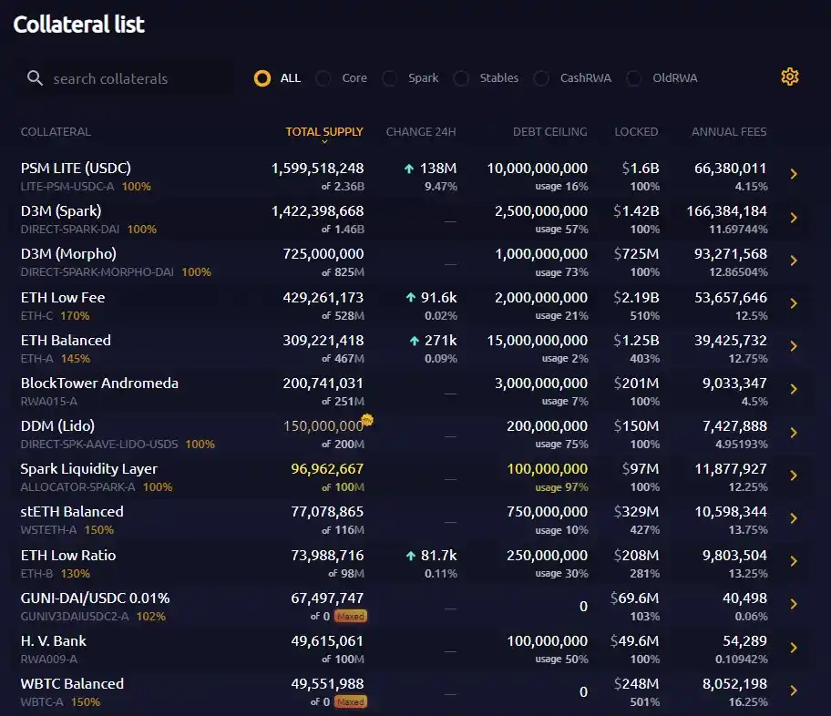 DAI / USDS 的抵押品列表 来源:https://makerburn.com/#/rundown
