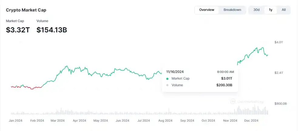 在加密货币市场中,自 2018 年以来,锚定美元的稳定币发挥了关键作用。它们不仅是交易的基准货币单位,也充当了影子美元资产的角色,活跃于转账支付等多个场景。以链上日均转账量为例,当前的日转账量稳定在 250 亿至 300 亿美元的高位区间,即便在市场低迷时期,该数据也未低于 100 亿美元。在交易量方面,根据 CCData 的报告,2024 年 11 月中心化交易所的稳定币月度交易量高达 1.8 万亿美元,超出了加密货币行业总市值的一半。结合 CoinMarketCap 的行业数据,我们可以估算 11 月的日均交易量为 2000 亿美元,即月度交易量达 6 万亿美元,这意味着稳定币在中心化交易量中占据了行业交易量的 30%。这一比例还未包括链上稳定币交易量,亦即其实际占比可能更高。除了交易量和转账量这两个核心指标外,稳定币也通过引入如美国国债等稳定收益的资产作为底层资产,提供稳定可持续的收益,为行业带来了正外部性,进一步促进了 Web3 与现实的连通和融合。