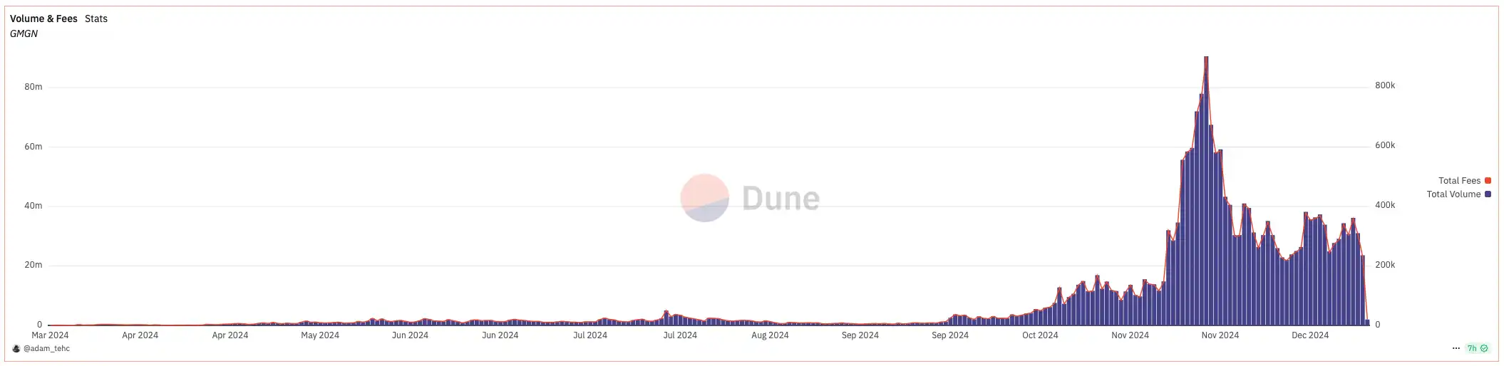 这一探索开启了代币分析 交易 Bot 一体化的赛道新趋势,随后出现的 Cash Cash Bot、DEXX 等平台均针对代币信息与交易的结合体验上进行优化,甚至一度传出「链上 Binance」的宣传标语。通过 API 手续费创造额外收益,改变了过去代币分析类工具依靠广告为主的变现方式。根据 Dune 数据统计,在 11 月 meme 交易高潮期间,通过 GMGN API 完成的日交易量最高达到了 9000 万美元,而该月 GMGN 平台通过 API 手续费实现的平均日收益则有近 40 万美元之多。