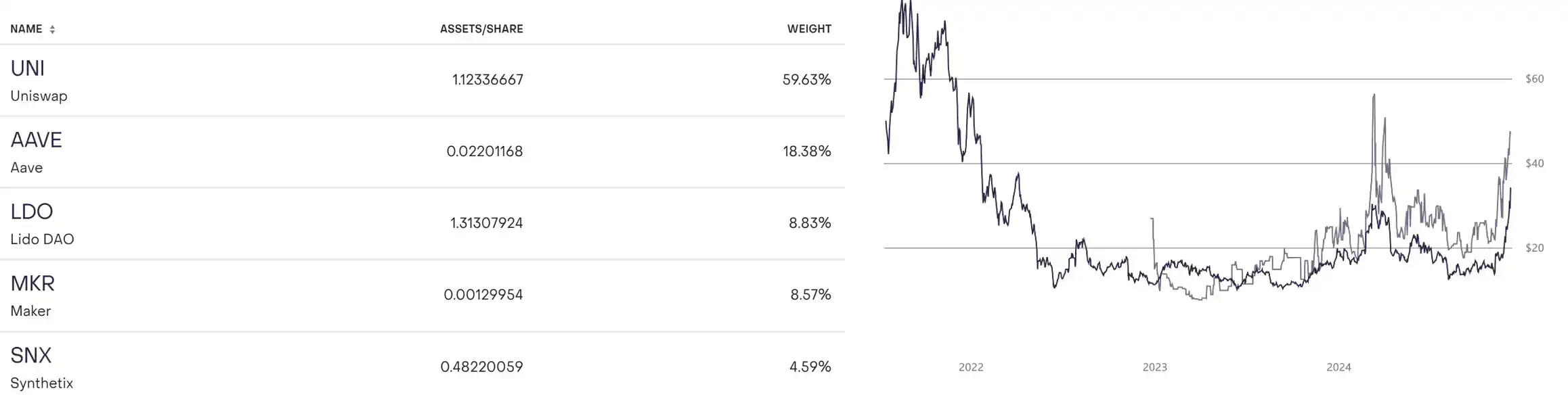 以 Grayscale 去中心化金融 (DeFi) 基金为例,该基金是首批以证券形式单独投资于一篮子去中心化金融应用的证券之一,其中包括了 UNI、AAVE、LDO、MKR、SNX 等标的。这些 DeFi 基金中的代币在大选之后表现良好,NAV per share(每股资产净值)从 13 美金飙升至 35 美金。