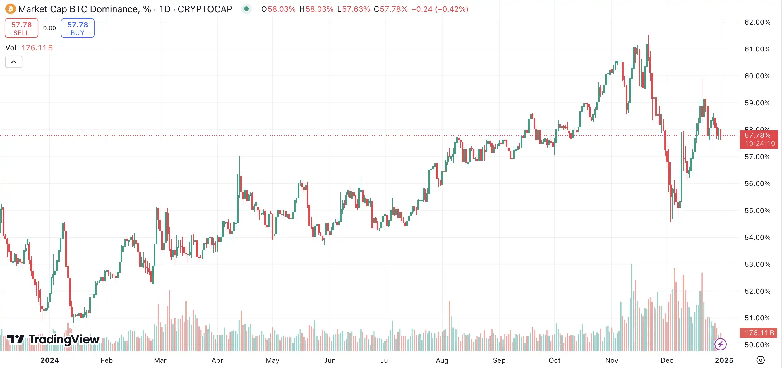 比特币市占率的变化一直是观察加密行业市场动态的重要指标,2024 年比特币市占率从年初一路攀升至 61%,与此同时,投资者感叹并没有多少资产能在今年跑赢比特币,山寨币的价格表现也让圈内人频频感叹本轮周期操作难度之高。