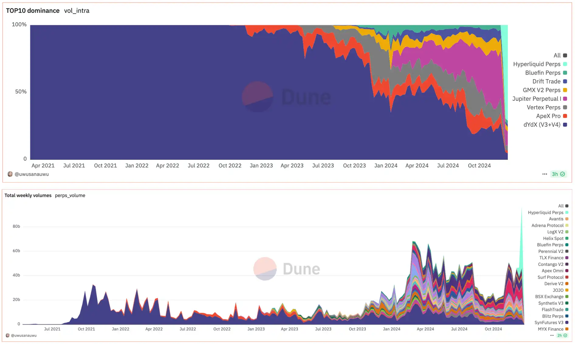 Perp DEX 市占率(上)及周交易量(下)对比,浅绿色部分为 Hyperliquid;数据来源:Dune Analytics