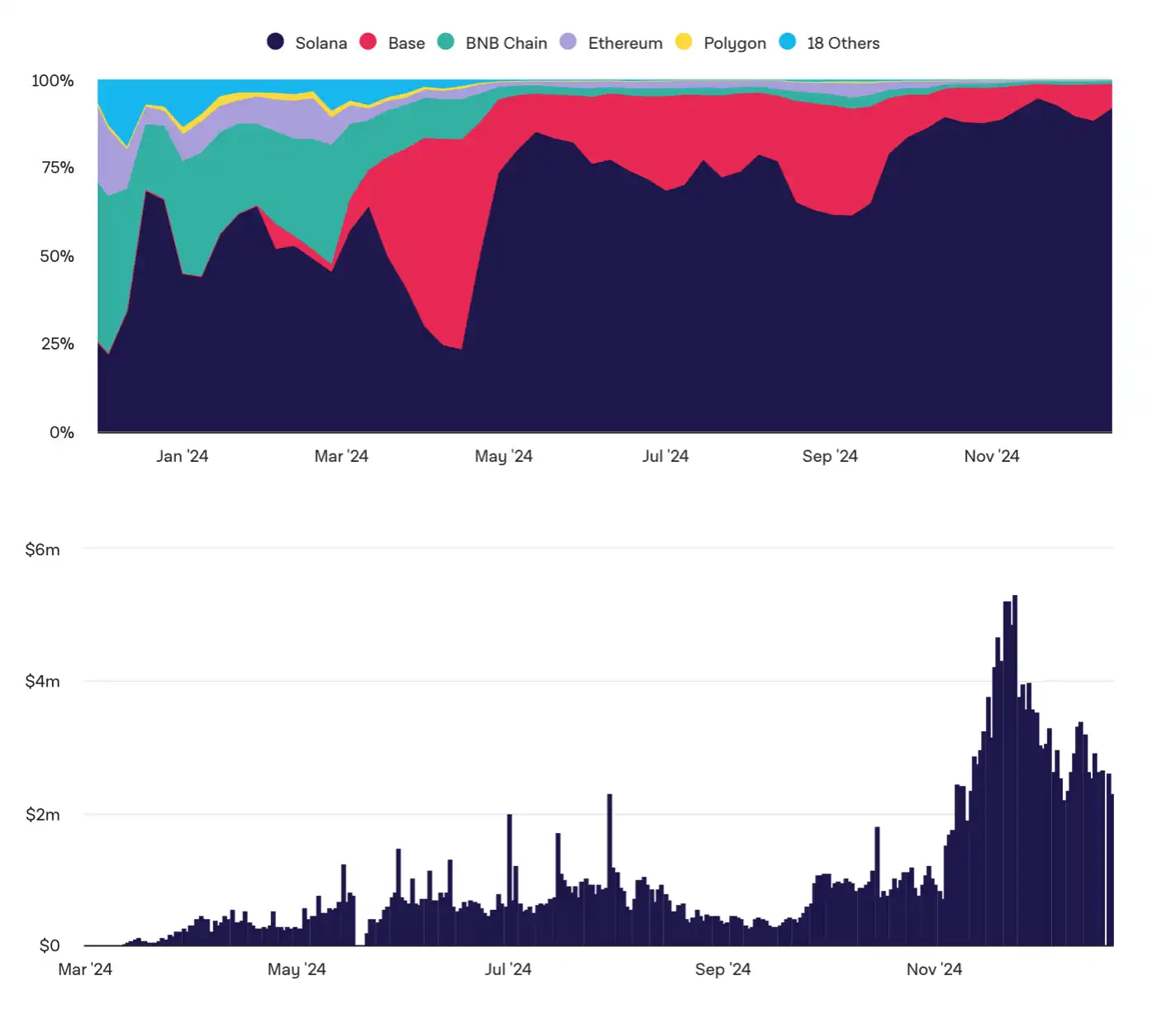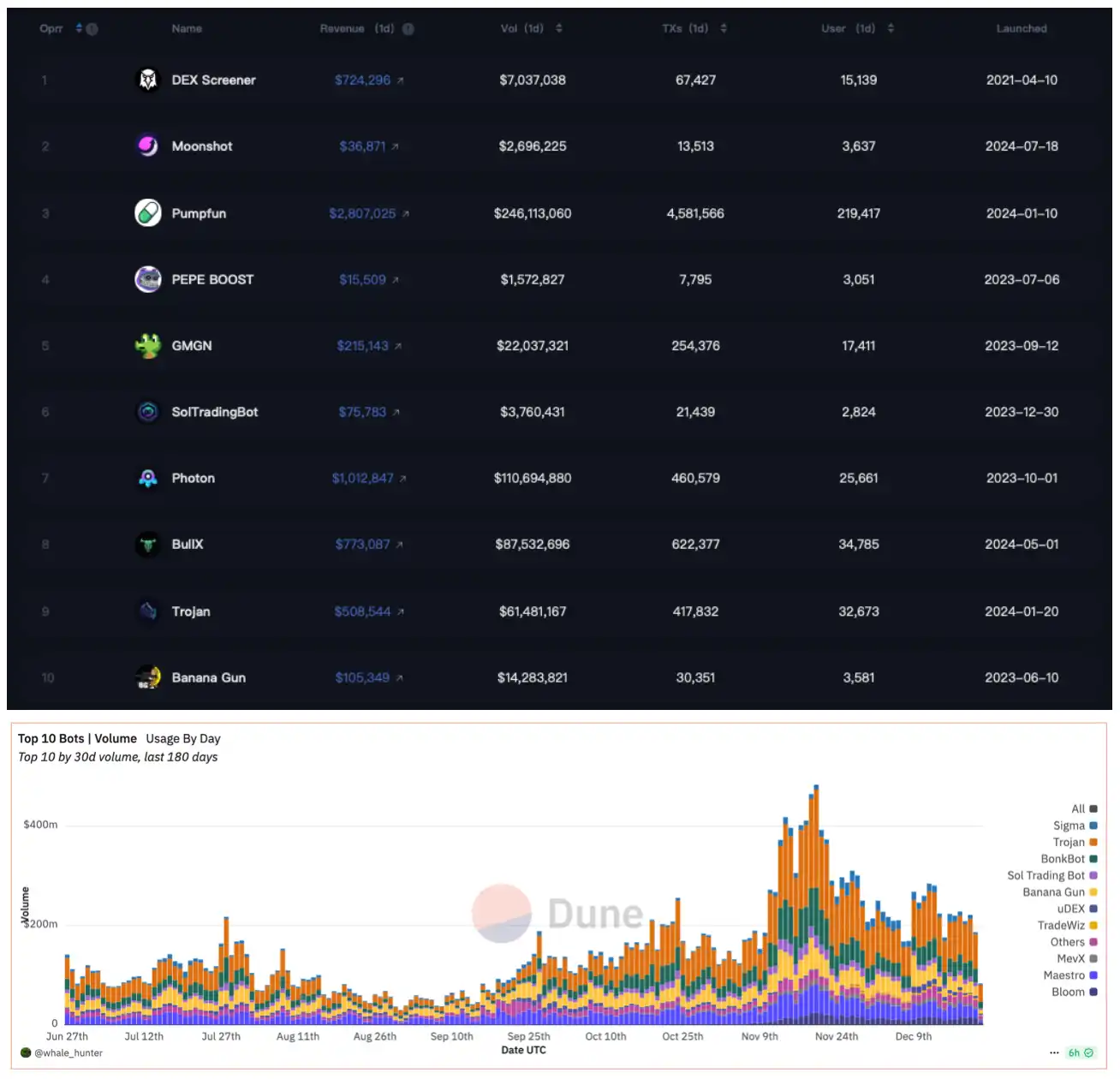 而 TG Bot 的竞争在 Solana 生态进入白热阶段,诸如 BullX、Trojan、Photon 等追求极致交易速度的产品先后冲进市场,至 11 月高峰时期,TG Bot 的日交易总量甚至接近 5 亿美元。