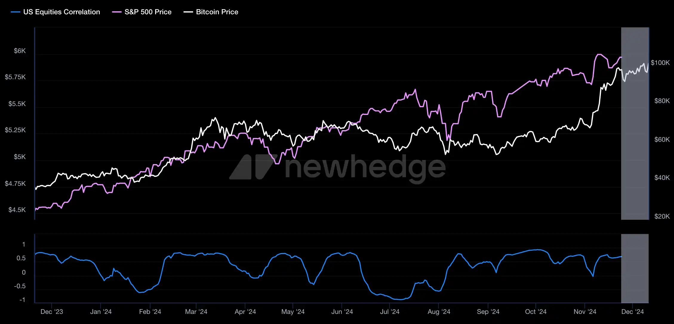 2024 年比特币和美股相关系数,图源:Newhedge