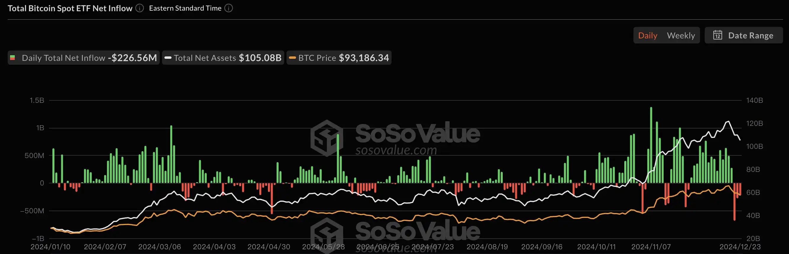 目前,比特币现货 ETF 吸收了平均每日比特币新增发行量的 259%,自上市以来,这些基金已累计获得 300 亿美元正流入,持有超过 140.8 万枚比特币,相当于总流通供应量的 7%。比特币 ETF 在 2024 年共有 155 天为净流入日,单日平均净流入为 5,233 枚 BTC;相较之下,93 天为净流出日,单日平均净流出为 2,702 枚 BTC。