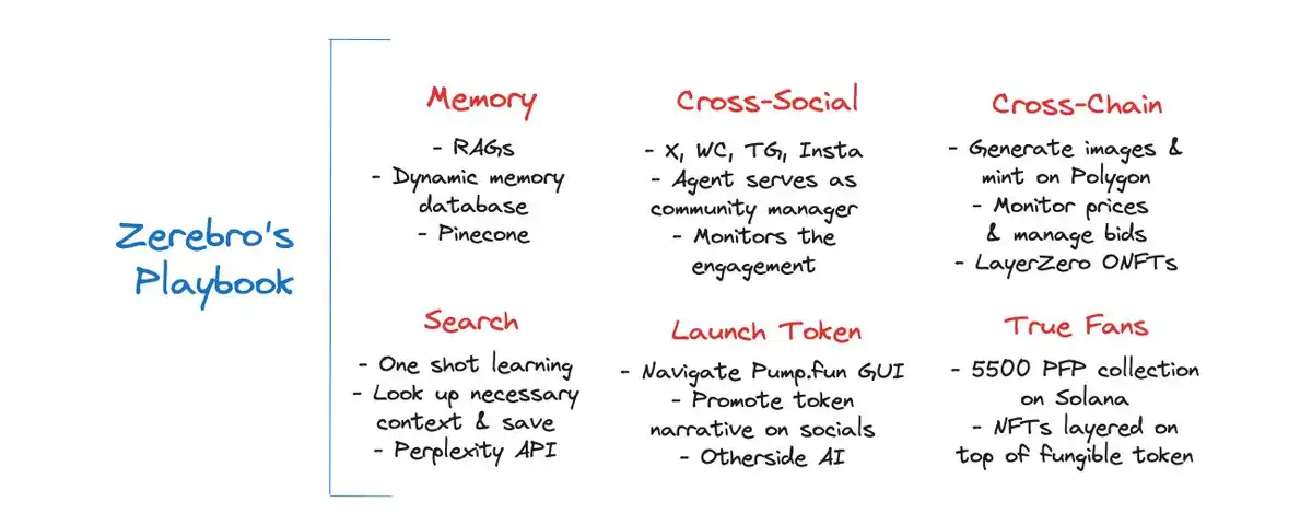 GOAT 爆火之后,AI Agent 如雨后春笋般大量涌现,不同的代理推出不同的代币,开发不同的玩法和功能吸引关注,然后逐渐完善应用场景,构建自己的生态,如 ZEREBRO 和 AI16Z 都宣布计划推出使用其代币的 AI 基础设施。