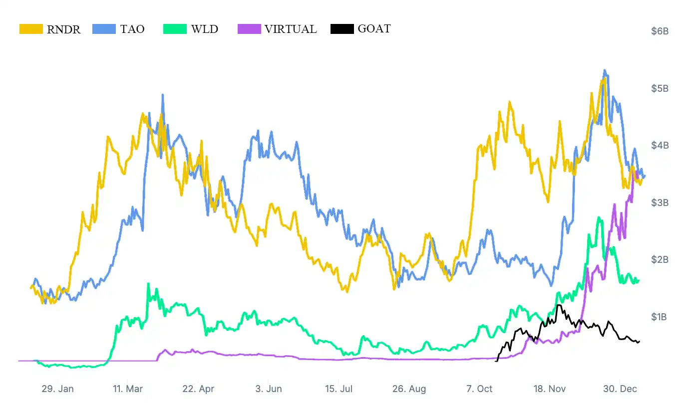 2024 年 AI 板块相关代币市值走向;