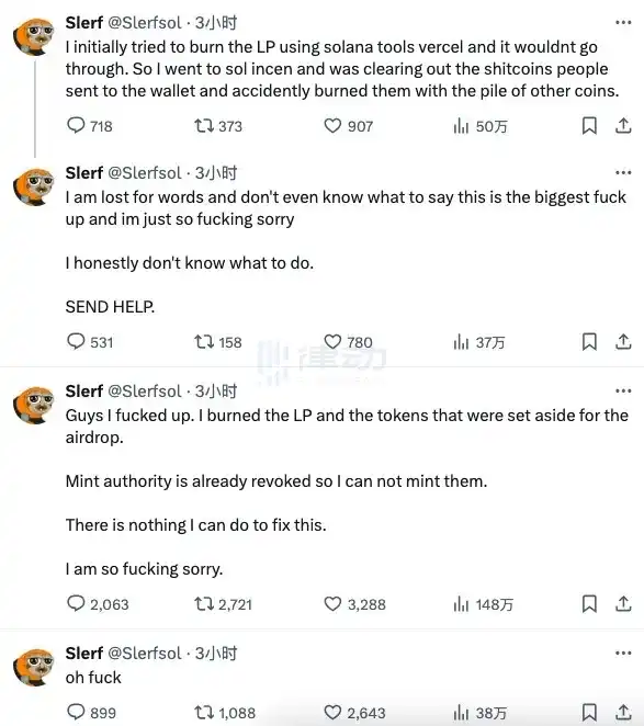 3 月 18 日,Slerf 项目创始人 @Slerfsol 在 X 平台发文,自己因误操作销毁了 LP 和空投预留代币,铸币权也已经撤销,他无能为力,甚至还在 Space 里真情实感的哭了出来。