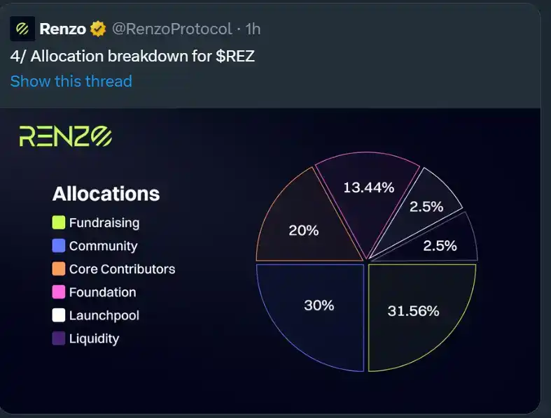 4 月 23 日,再质押项目 Renzo 公布空投细则,在 Renzo 发布的第一版公告中,其代币分配饼图如下,堪称统计学教材,分配给 Binance Launchpool 和流动性的两个 2.5% 份额画得和 20% 相差无几,而底部的「一半」是 62%。社区直言这是「图表犯罪,和代币经济学作假没有区别」。