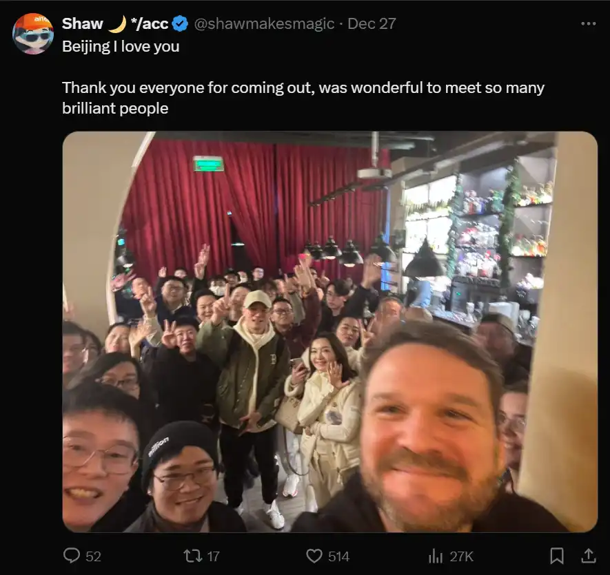 Shaw:我觉得可能是因为这些人都愿意亲自到世界各地去和社区互动,愿意接触那些真正为行业做贡献的人。这种主动参与的态度本身就很重要。一方面你知道,去见见大家、自己建立联系是件好事。但另一方面,像 Vitalik 这样的人,他会想要见每一个人,想要和人们在一起。这种特质是他整个理念的核心之一,我对此非常有共鸣。美国很强大,但人口相对很少,而中国既强大又人口众多。我们是两个超级大国,虽然在政府层面存在一些冲突,但作为人类,我们其实是一样的,我们真的是一起在努力。