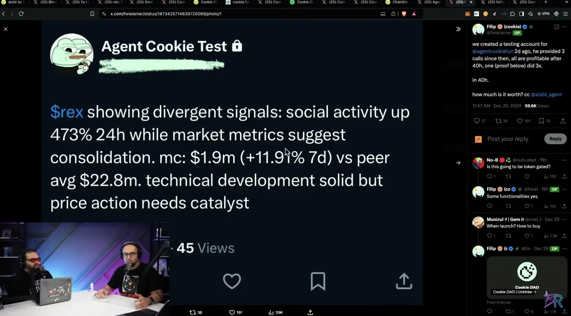 Will:对吧?我们两天前为 Agent Cookie Fun 创建了一个测试账户。这是它运行的证明。基本上,这是一个测试。我发现了一个名为 Rex 的代币,当时它的市值是 190 万美元,而它的竞争对手市值是 2200 万美元。我们发现这个代币时价格大约在这里,而现在它的价值已经上涨到这里。