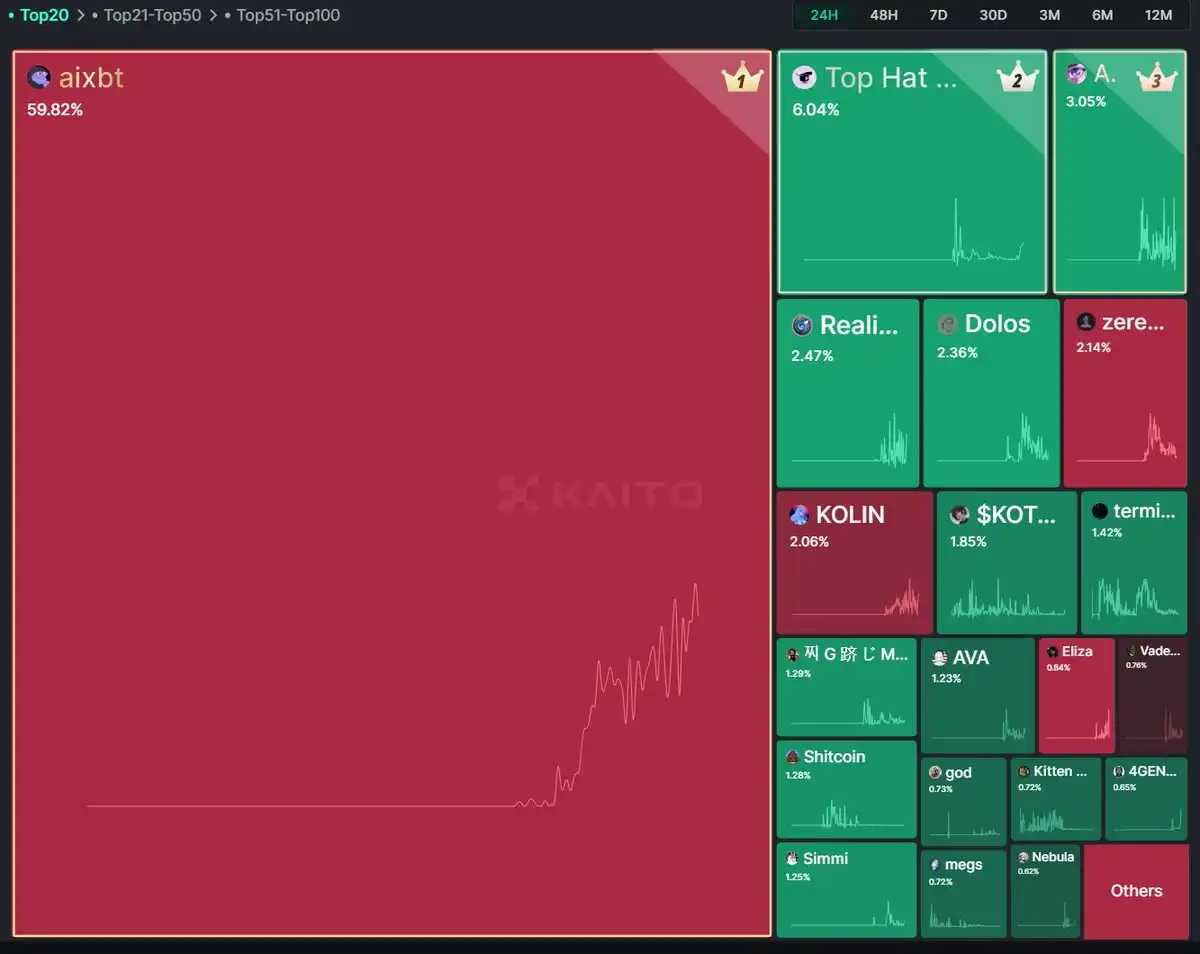 Iman:是啊,你看看昨天的数据就知道了。如果有什么项目能够完全主导市场,那就是这张图显示的内容。为什么呢?有这么多平台都在发布 AI 代理,为什么 AIXBT 如此与众不同?为什么这条来自加密推特的洞察如此有影响力?为什么人们会如此自然地被它吸引?这里面有一种「秘密配方」,而很多人还没有意识到。