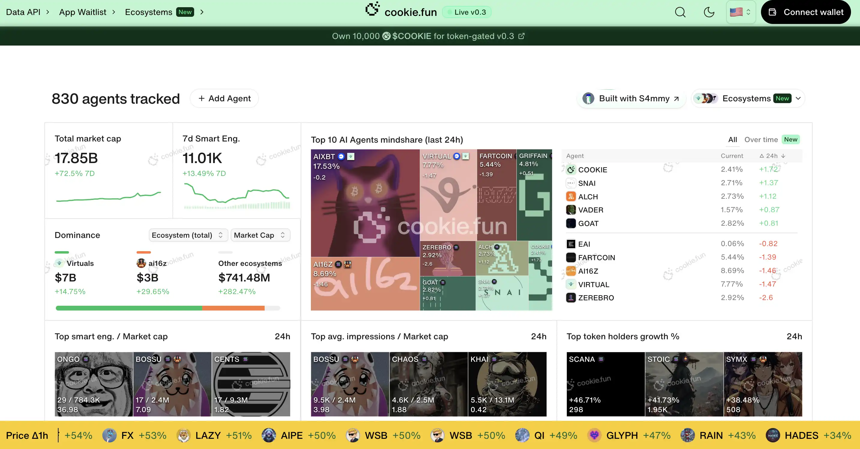 Iman:最近随着 Cookie.Fun 的上线,它的定位发生了完全转变,市场情绪也随之逆转。核心功能主要是聚合数据源,然后让所有的 AI 代理在心智份额、市场份额等方面进行对比和竞争。
