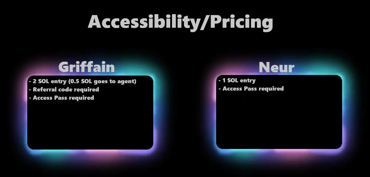 最大的区别是费用,Griffain 收取 2 SOL 的前期费用,而 Neur 只收取 1 SOL 的前期费用。但是,Griffain 会将其中的 0.5 SOL 存入用户发代理钱包,因此 Griffain 的实际费用约为 1.5 SOL。