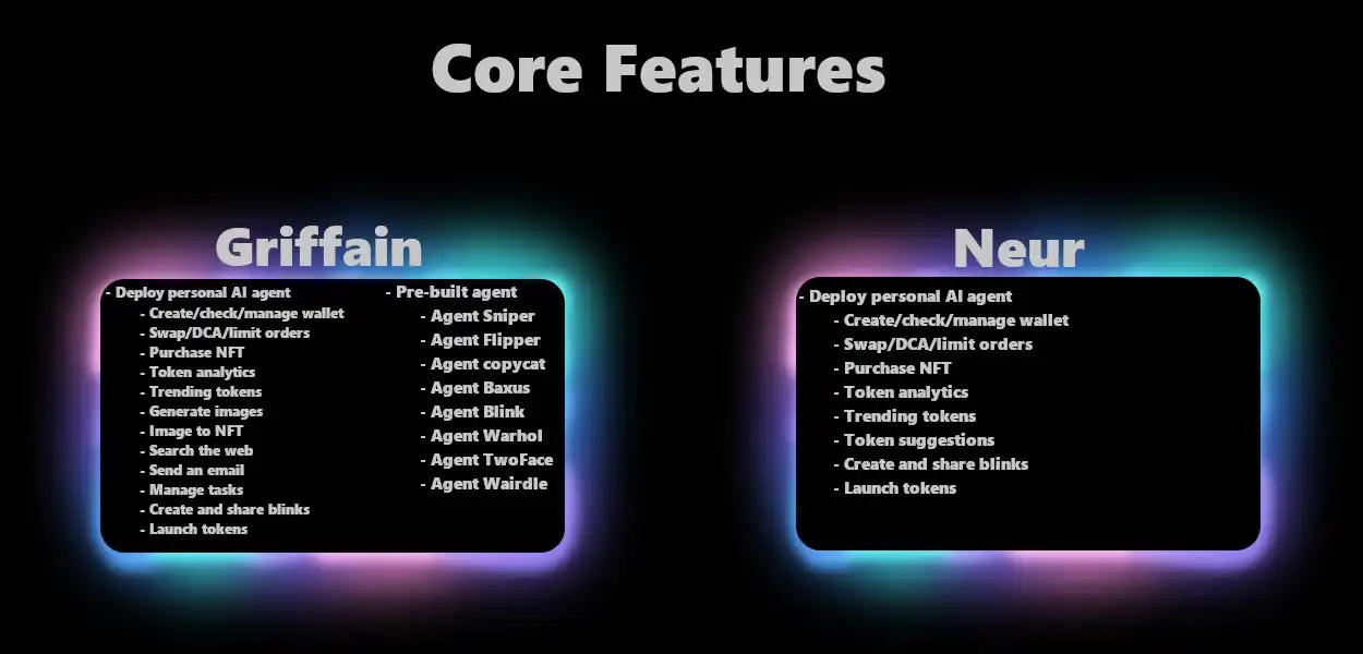 首先探索每个平台提供的不同功能。如下图所示,Griffain 为用户提供的功能更多,更广泛。但是 Neur 提供的功能相对更加细致。
