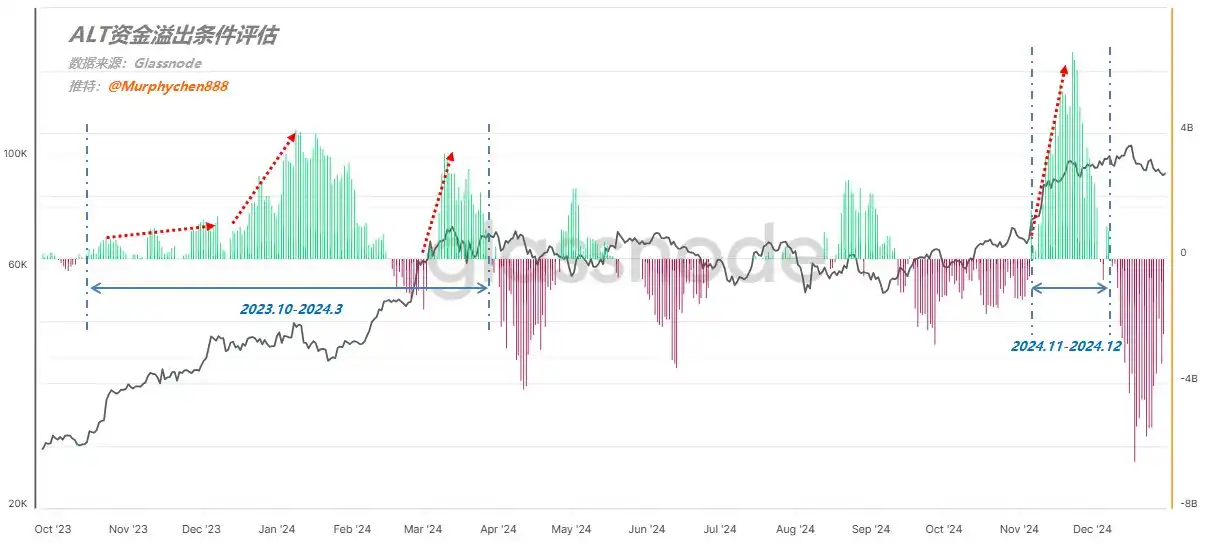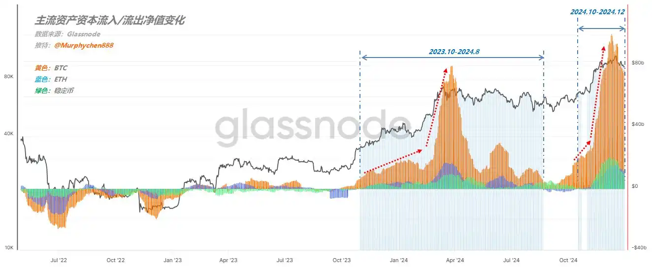 从数据上看,在 2023.10-2024.8 和 2024.10-2024.12 这两段时间内三大主流资产同时出现资本净流入,且在 2024.3 月和 12 月达到顶峰。这也是本轮周期内到目前为止市场情绪最 Fomo 的时间点。