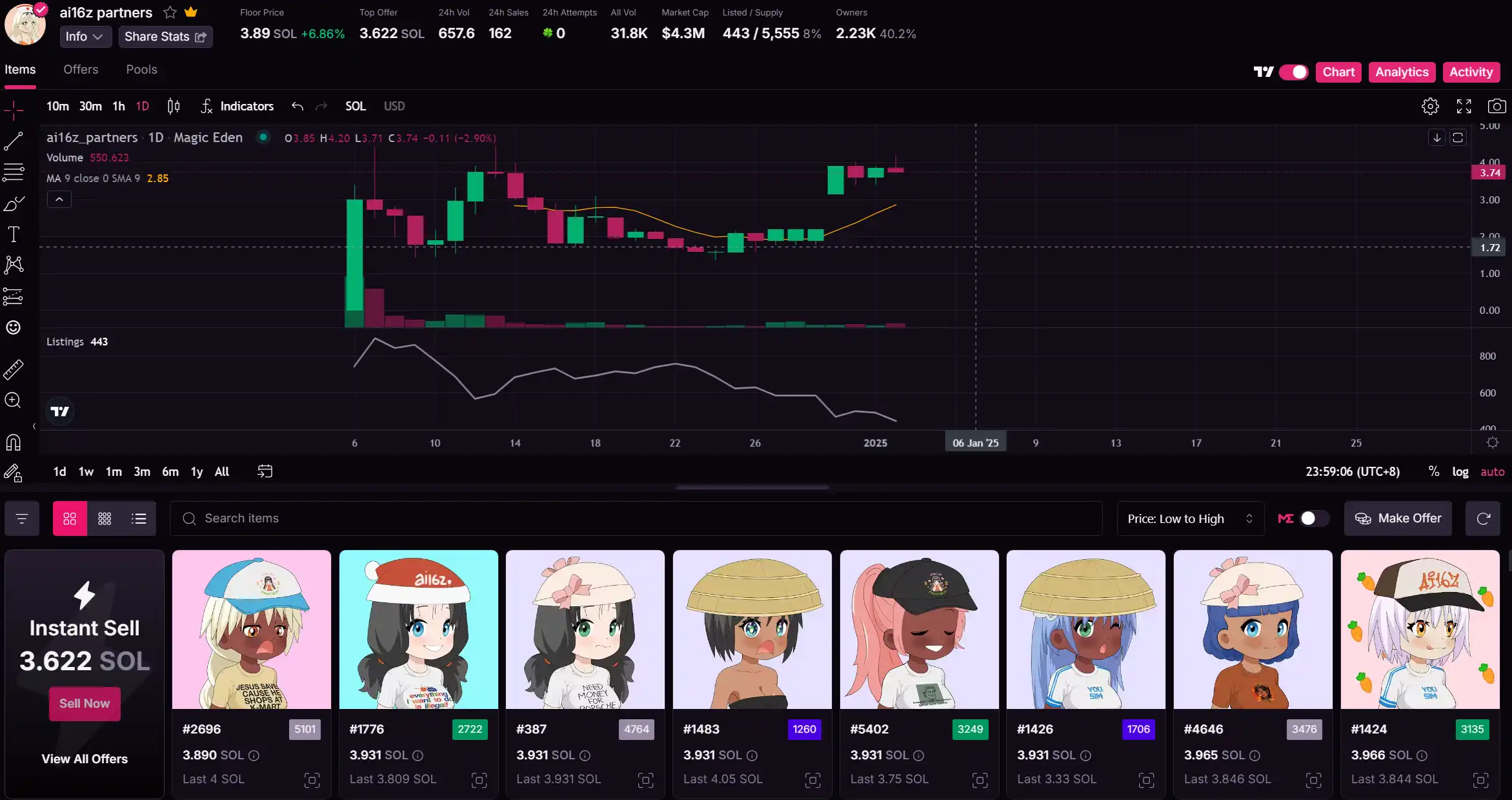 目前不知道会有什么具体的效用,系列本身也不是 AI 叙事,就是和 ai16z 有着紧密的关系。目前地板价接近 4 SOL,接近前高。