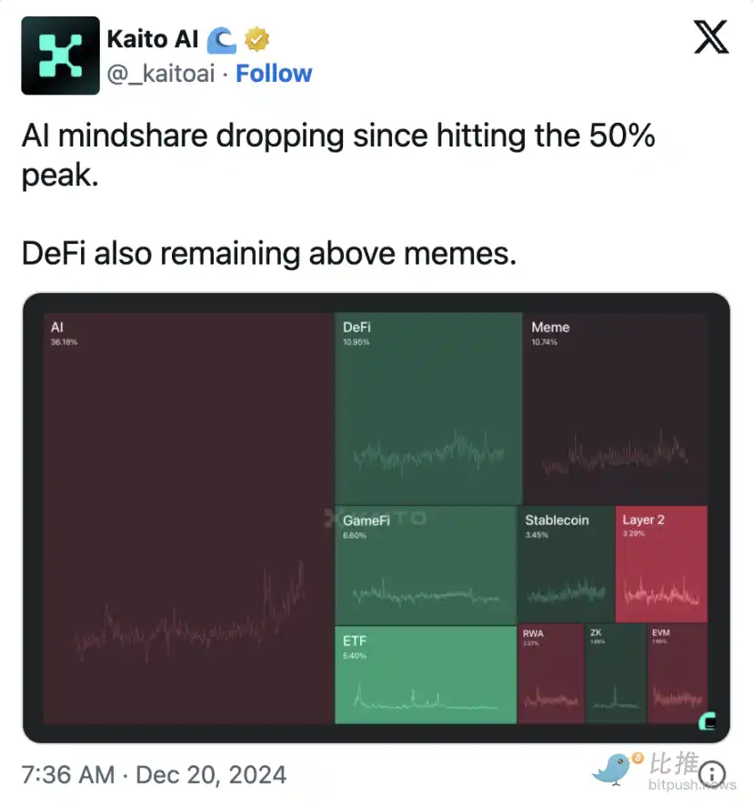 虽然 memecoins 可能会超过现实世界资产或 AI 等领域,但 AI 代理却独树一帜,通常被视为下一个超级周期的驱动力。人工智能仍处于巅峰状态,随着人工智能代理的进步,链上人工智能经济已经占据了很大一部分市场份额,根据 Kaito AI 的数据,该份额将在 2024 年达到 50% 的峰值。受对人工智能服务前所未有的需求推动,这一趋势很可能在 2025 年延续。