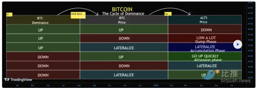 比特币主导地位是个经典参照指标,请好好利用它来把握交易时机。BlockchainCenter.net 等网站可以帮助评估市场当前处于山寨币季还是比特币季。需要注意的是: