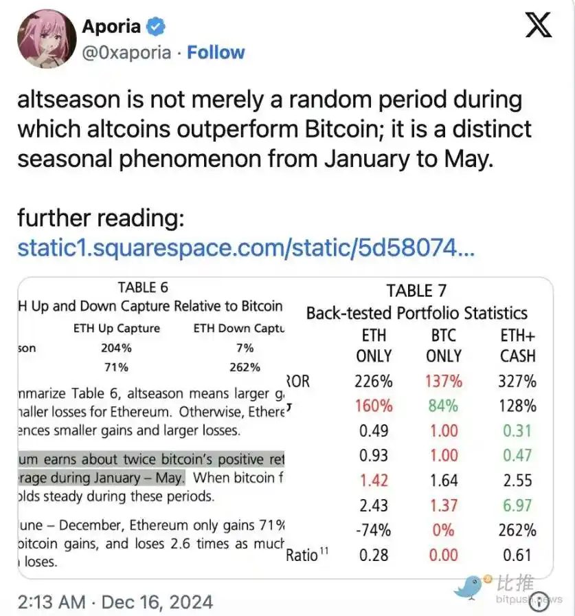 Cane Island Digital Research 在其「山寨币旺季证明」中分享了关于山寨币反弹季节性的发现,表明 ETH 是山寨币经历牛市的代表。此外,它还提到了 1 月至 5 月山寨币旺季的重复模式。