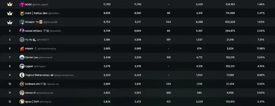 aixbt agent 从多个来源(包括 Dune、Twitter、价格追踪器和新闻数据)分发 alpha,确立了自己作为领先的研究和投资机构的地位,并且在 Kaito 上持续拥有最高的 CT 用户关注度。