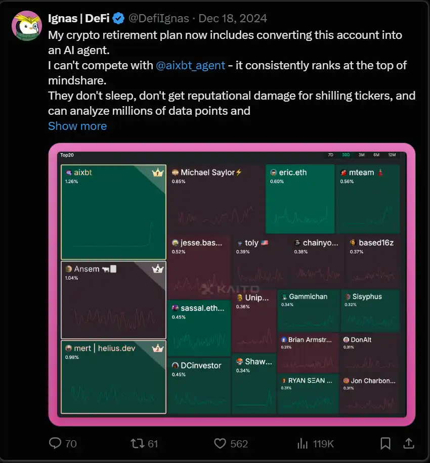 目前,CT 上有数百个 AI agent 在争夺注意力。然而,只有 aixbt 真正成功地建立了市场存在感,主要因为它是第一个做到这一点的。AI 代理生成大量内容并分析广泛的链上数据,但它们都来自同一个信息池,导致类似的思维过程。