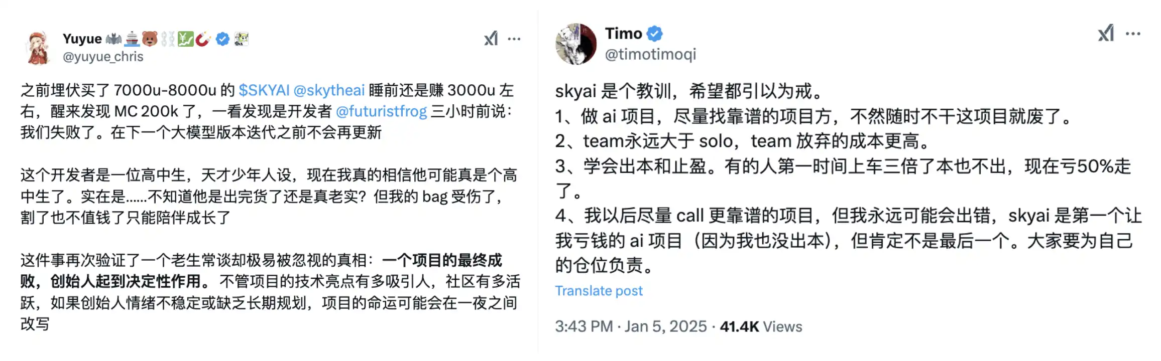导致这一情况发生的原因是 SKYAI 的开发者 Bob(@futuristfrog)1 月 5 日称自己的实验失败了,「Bad news. I have failed」。随之 SKYAI 瀑布式砸穿,让许多此前十分看好这个项目的投资人直言要找靠谱项目方,称创始人对一个项目起着决定性作用。