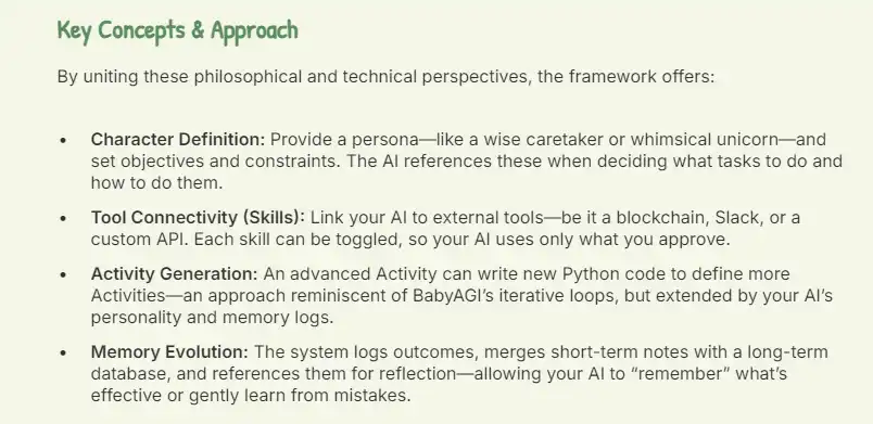 · 哲学根源:该框架受到 Pippinian 自然主义的启发,将 AI 视为一个更广泛数字生态系统中的一部分。它通过记忆、约束条件以及不断演化的目标感来驱动 AI 的发展。我们提倡一种细腻的设计理念:让 AI 自主发现生活中的「小奇迹」,并通过成功与失败不断学习和成长。