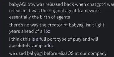 事实上:「BabyAGI 是在 ChatGPT-4 发布时推出的,它是最早的智能体框架,可以说是智能体技术的起源。BabyAGI 的创造者无疑远远领先于 AI16z。我认为 ElizaOS 的开发更像是一次彻底的框架移植,而且几乎可以肯定会全面超越 AI16z。我们公司在使用 ElizaOS 之前就已经在内部使用过 BabyAGI。」