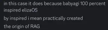 「在这种情况下,这种说法确实成立,因为 ElizaOS 的灵感完全来源于 BabyAGI。这里的「灵感」几乎可以理解为,BabyAGI 实际上奠定了 RAG (Retrieval-Augmented Generation,检索增强生成) 技术的基础。」