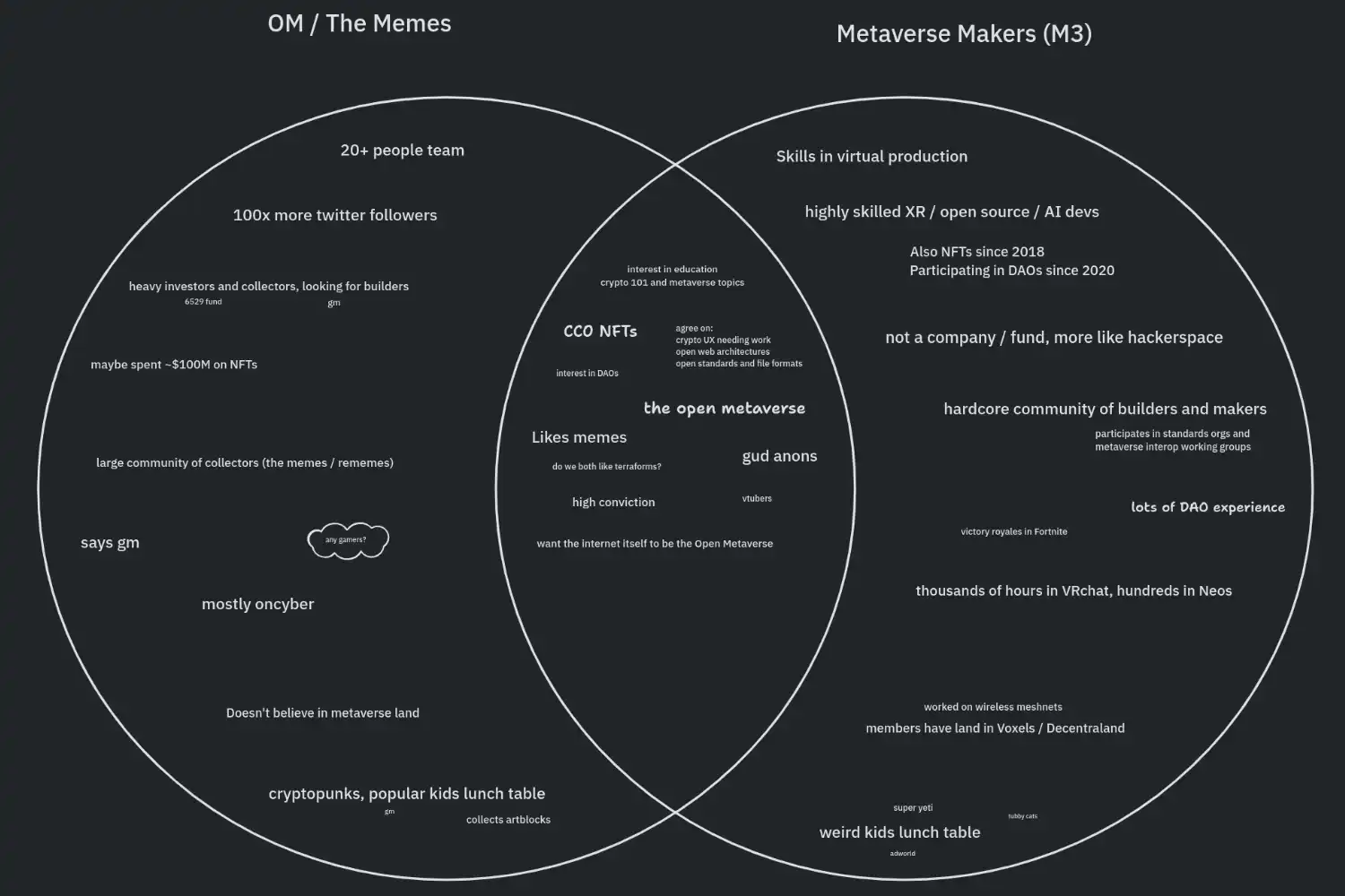 提到 M3org 就必须提到一个神秘人 JIN「@dankvr」。他从未在网络上露面,作为 Shaw 的多年好友与 M3org 的主要贡献者,他投身 VR 和 Crypto 领域已经超过 10 年的建设者,自 2013 年开始参与 VR,自 2017 年开始构建 NFT,自 2019 年以来投身 DAO 做出贡献。JIN 在描述自身的经历时,提到了想要像丝绸之路一样将不同的虚拟世界平台连接在一起,就像将大学和研究实验室连接在一起最终形成互联网一样。而这个愿景与 M3org 的愿景无异,只是许多像 Jin 一样的人聚在一起组成了这个神奇的 DAO,其中可能很多人都是受 Hackers 或者 Matrix 等电影书籍文化影响,一心只想构建 SnowCrash 里描绘的 Metaverse。