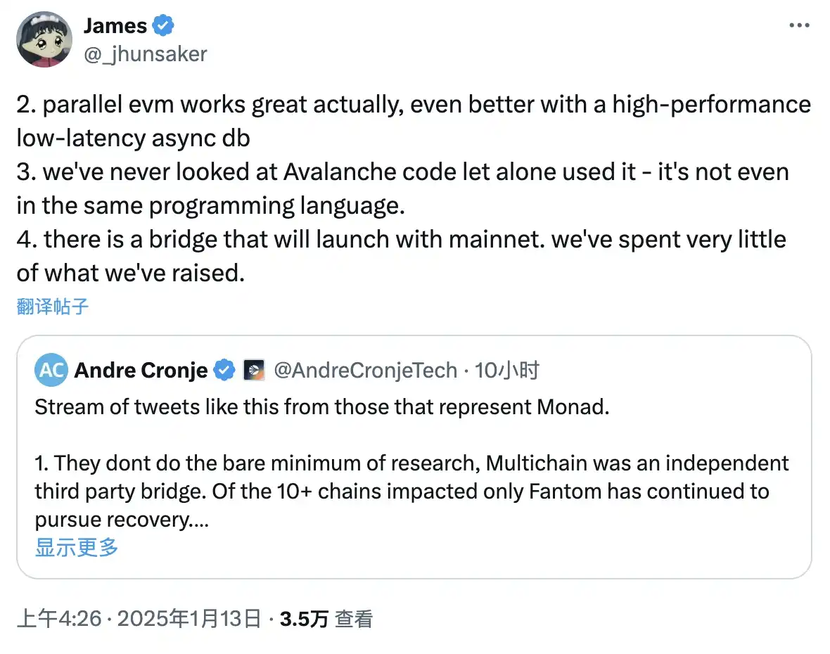 AC 下场之后,Monad 的两位联合创始人 Keone Hon 和 James Hunsaker 也相继下场回应,但或许是自觉 tunez 的挑衅行为理亏,两位联创的语言要显得平和了许多,并未进一步激化矛盾。